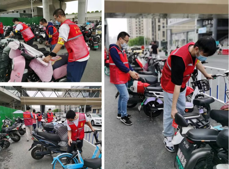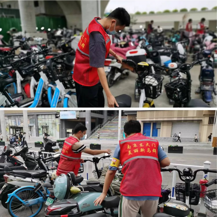 另一邊,元帥班和初心班的男干部也不甘示弱。面對停放雜亂的電動車,他們互相配合,合作整理,并引導正在停車的車主有序停放。原本略顯雜亂的停車區(qū)很快變得井井有條起來。